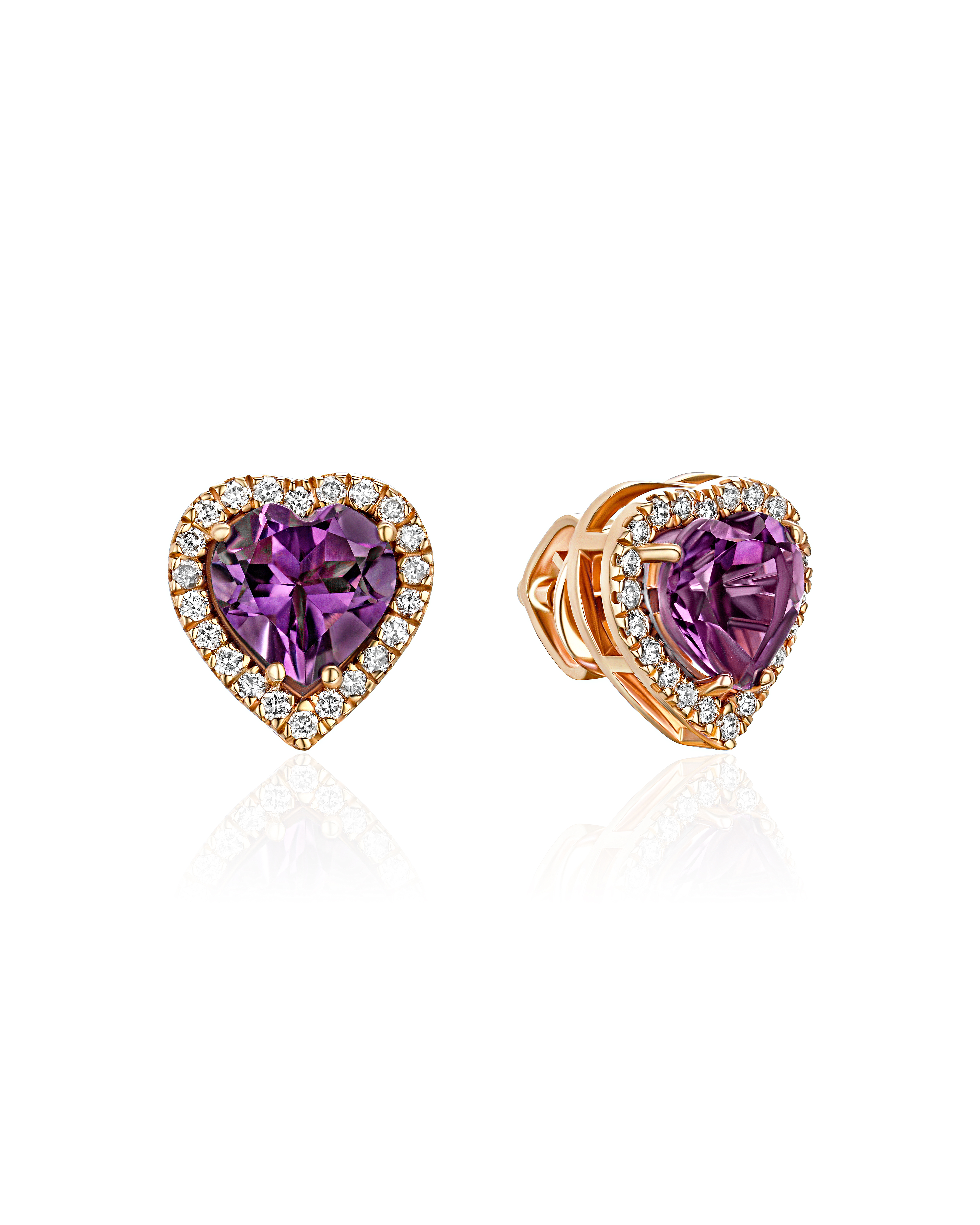 Золотые пусеты аккуратно обрамляют редкие и ценные камни, бережно подчёркивая их натуральный цвет и глубину. Классическая форма зажимов обеспечивает удобное и безопасное крепление, не отвлекая внимания от основного элемента — дивного аметиста.