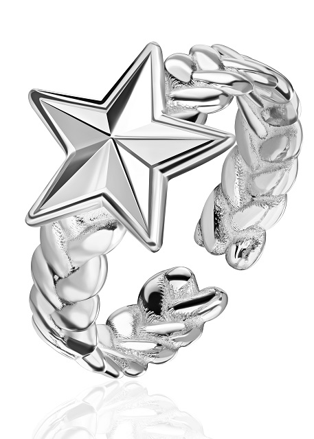 Дизайн кольца вдохновлен стилем советской эпохи, смешанным с элементами научной фантастики и киберпанка. Центральным элементом композиции выступает стилизованная звезда, которая символизирует идеи прогресса и величие человечества. Металлический блеск серебра добавляет изделию особую привлекательность и подчеркивает его футуристический характер.