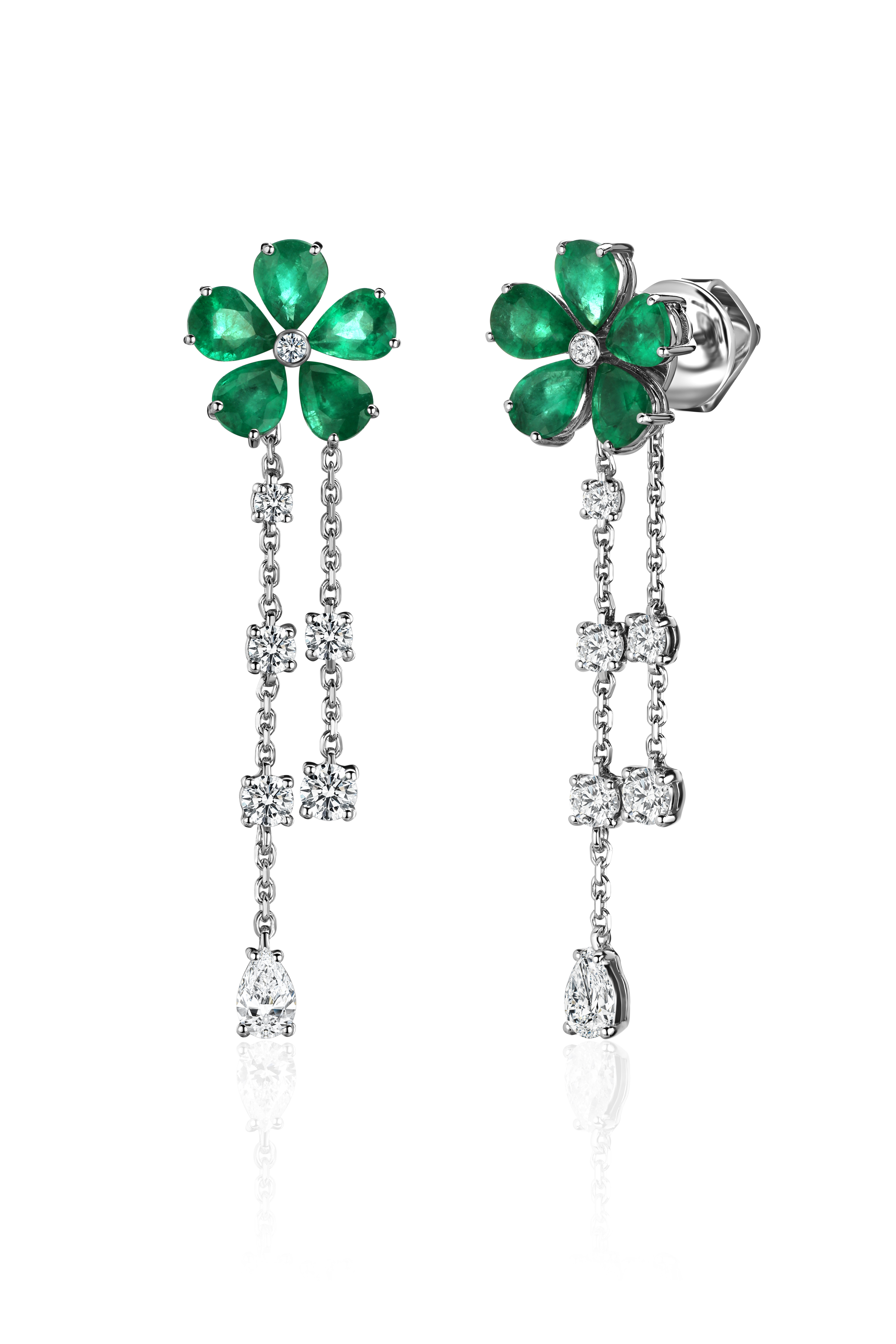 Серьги с изумрудом и бриллиантом в форме цветка — это настоящее воплощение изысканного вкуса и художественного таланта мастера. Удивительный симбиоз природных мотивов и дорогих минералов создает впечатление живой картины, раскрывающей внутренний мир природы и магии драгоценных камней.